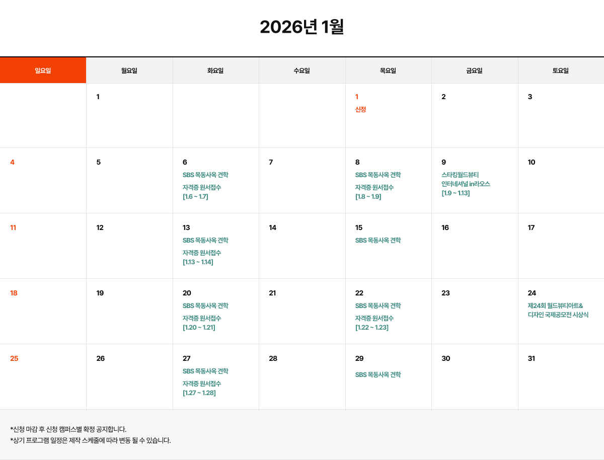| 34 | 2026³â 1¿ù ¹æ¼Û±¹ ÇöÀå¼ö¾÷ ÇÁ·Î±×·¥ÀÏÁ¤ | º»»ç | 2025-12-31 |